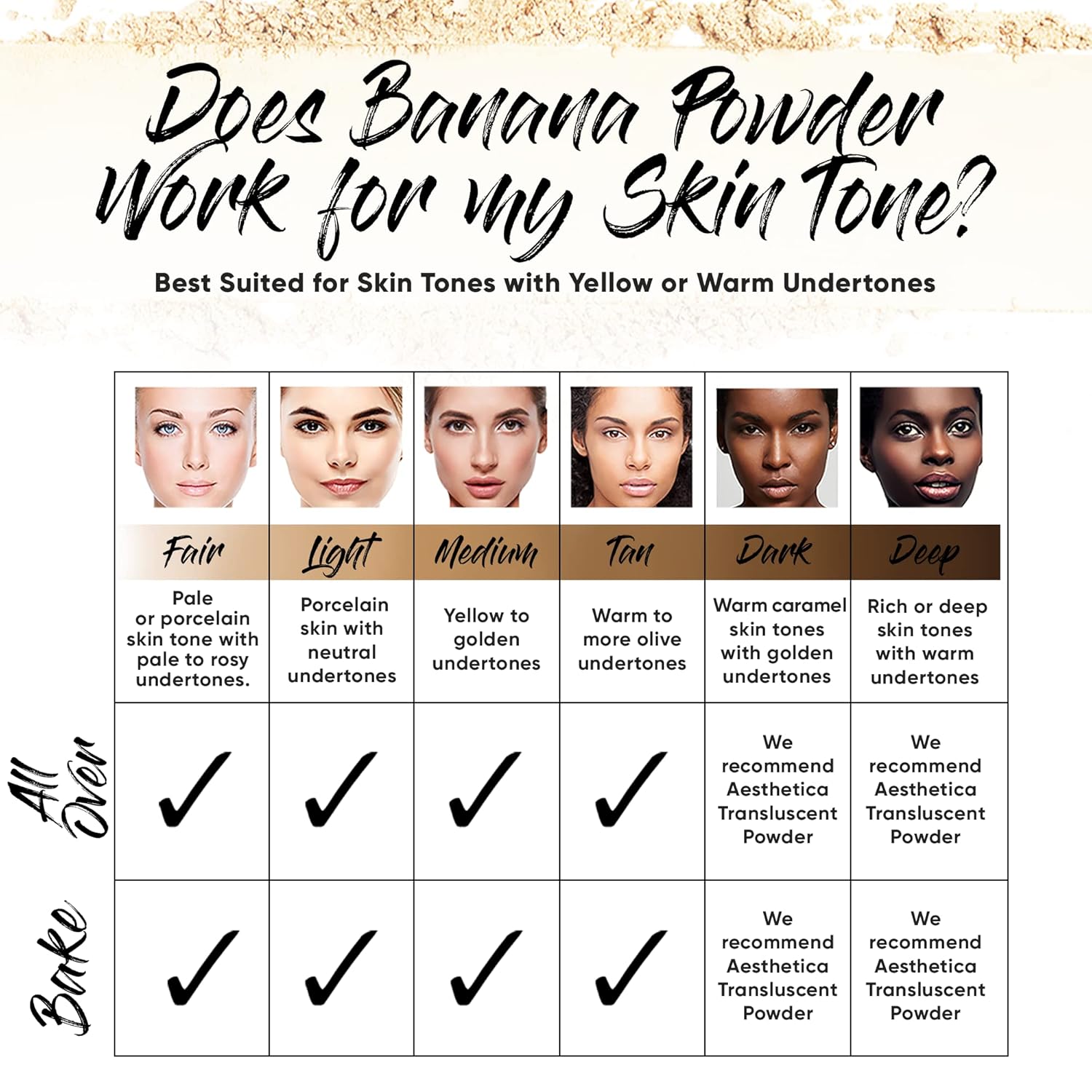 Aesthetica Banana Powder is best suited for those with Fair to Dark skin tones with YELLOW undertones. This product will not work well for those who have beige and pink undertones. For Beige and Pink undertones, we recommend the Aesthetica Translucent Setting Powder.
