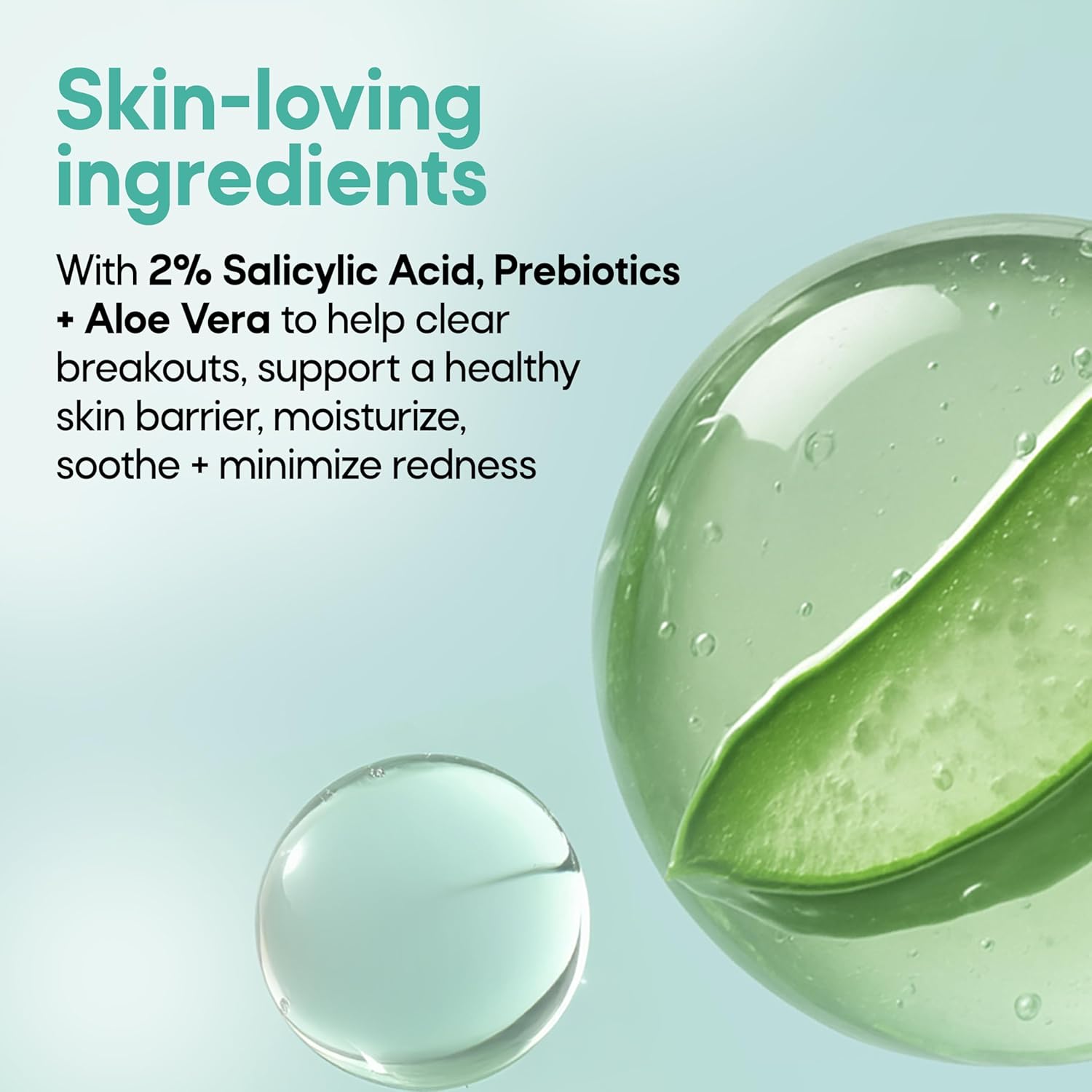 SKIN-BALANCING INGREDIENTS: Formulated with 2% Salicylic Acid to help clear breakouts, Prebiotics to smooth + support a healthy skin barrier, and Aloe Vera to moisturize and soothe skin irritation