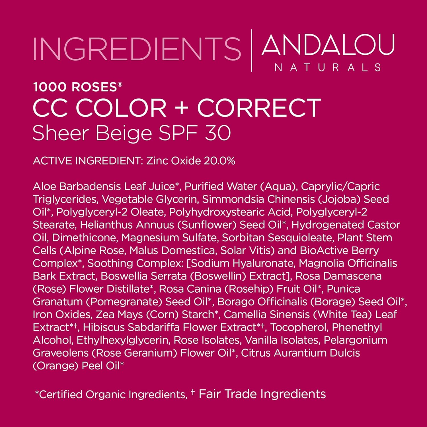 Color Correcting Sunscreen with Sheer Beige Tint Andalou Naturals 1000 Roses CC Color + Correct SPF 30 Face Sunscreen – the perfect two-in-one face cream that will leave your complexion looking flawless while providing essential hydration and broad-spectrum sun protection. With 20% non-nano zinc oxide, this sunscreen provides broad spectrum protection against harmful UVA/UVB rays. With alpine rose stem cells, this tinted moisturizer provides sheer mineral coverage that works to even out skin, while delivering powerful antioxidant benefits that help to improve skin’s natural defenses against environmental stressors, and keeps your skin looking healthy and radiant. Pomegranate seed oil, rich in antioxidants and omega fatty acids, works to moisturize and soothe your skin, leaving it feeling soft and supple. Rosa Centifolia Extract helps smooth the skin’s texture, and postbiotics help support the skin’s microbiome. Alpine Rose Stem Cells protect and restore vitality, postbiotic ferment help induce skin renewal and barrier protection. Fruit Stem Cell Science is our signature innovation for skin care products to protect and support healthy skin. Our products feature only ingredients that are gluten-free, sustainable, cruelty-free and nature-derived. Non-GMO remains a core brand value of Andalou Naturals and we continue to source superior non-GMO ingredients for our products.