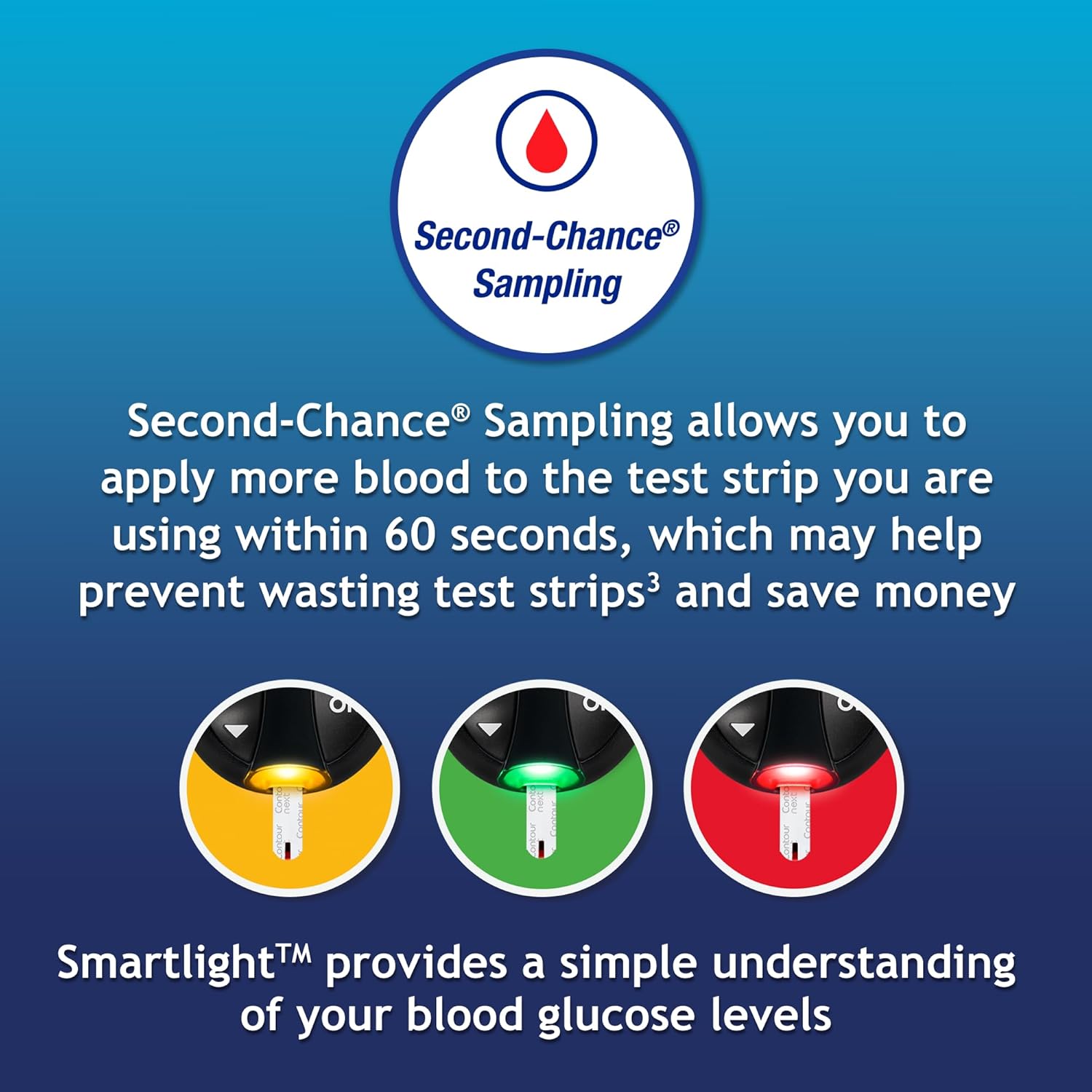 SECOND-CHANCE SAMPLING (3): Apply additional blood to the same test strip within 60 seconds to help reduce strip waste, avoid unnecessary retesting, and save money over time with our blood sugar testing kit