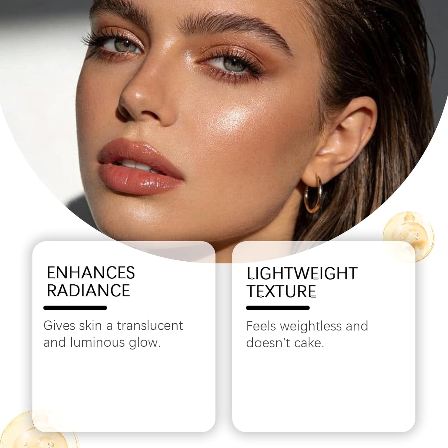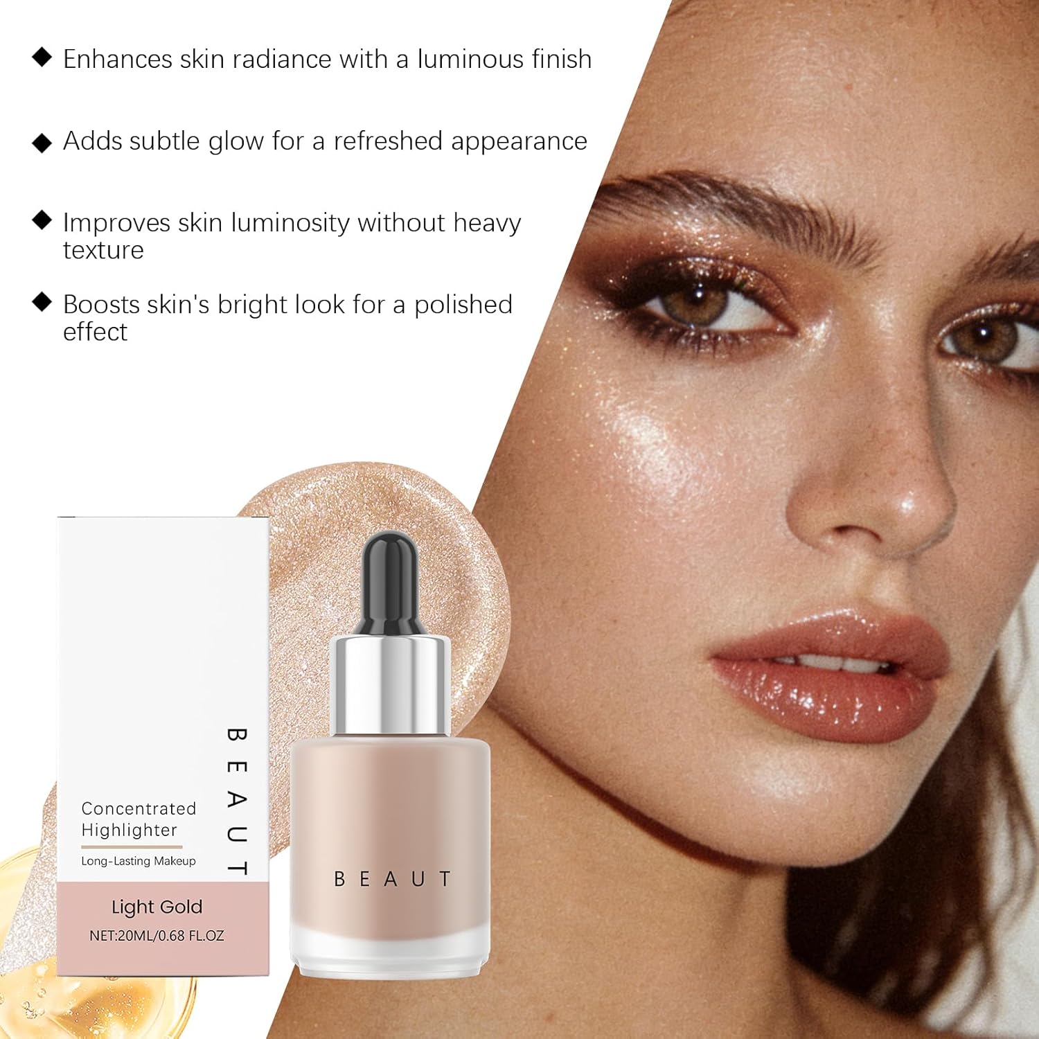 Universal Honey-Toned Radiance: These Light Gold highlighter drops offer a warm, honey-toned luminosity that flatters a wide range of skin tones. It creates the illusion of a healthy, natural glow for a classic and luminous appearance.