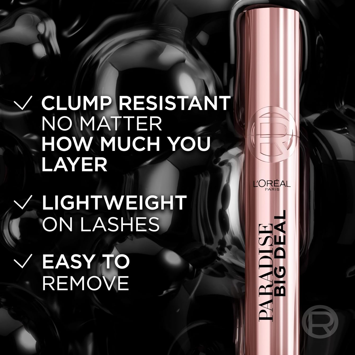 L’Oreal Paris Paradise Big Deal Mascara, Volumizing and Lengthening Formula, Buildable, Clump Resistant, Washable Blackest Black Mascara, 0.33 Fl Oz