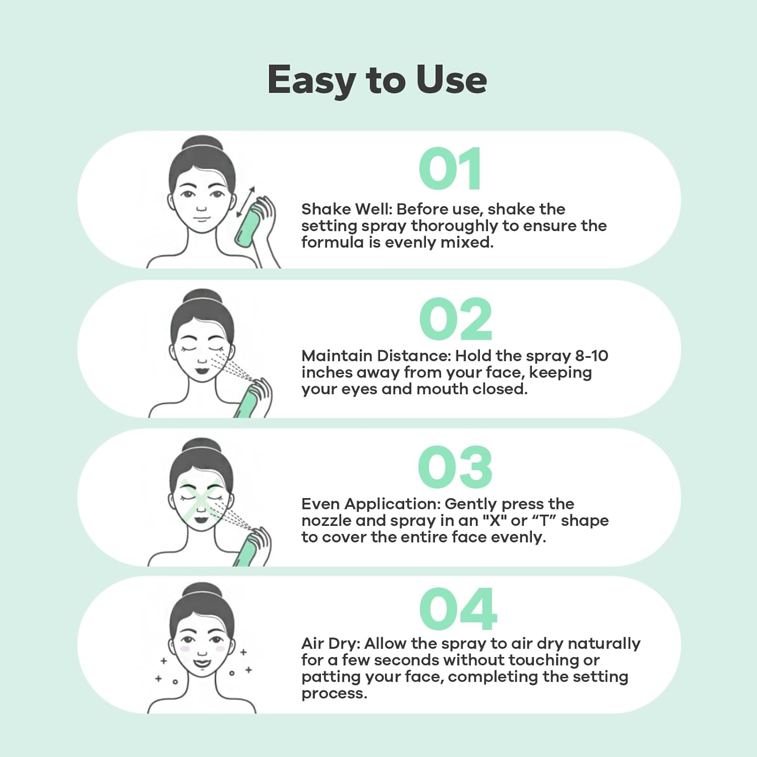 Easy to Use: CharmCherry Setting Spray is designed for easy application. Simply press and release a fine mist that evenly covers your entire face, setting your makeup in seconds. To use, hold the bottle about 8 inches from your face and spritz 2-4 times after applying makeup, allowing it to dry naturally. The 02# Dewy Finish adds a luminous glow without making your skin feel greasy.