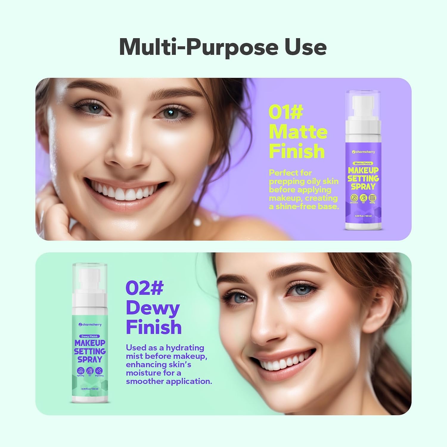 Multi-Purpose Use: CharmCherry Setting Spray is more than just a finishing spray—it can also be used as a primer to even out skin tone and extend makeup wear.The 02# Dewy Finish can be used as a hydrating mist before makeup, enhancing skin’s moisture for a smoother application. Both sprays can also be used throughout the day as a refreshing mist to revitalize your look.