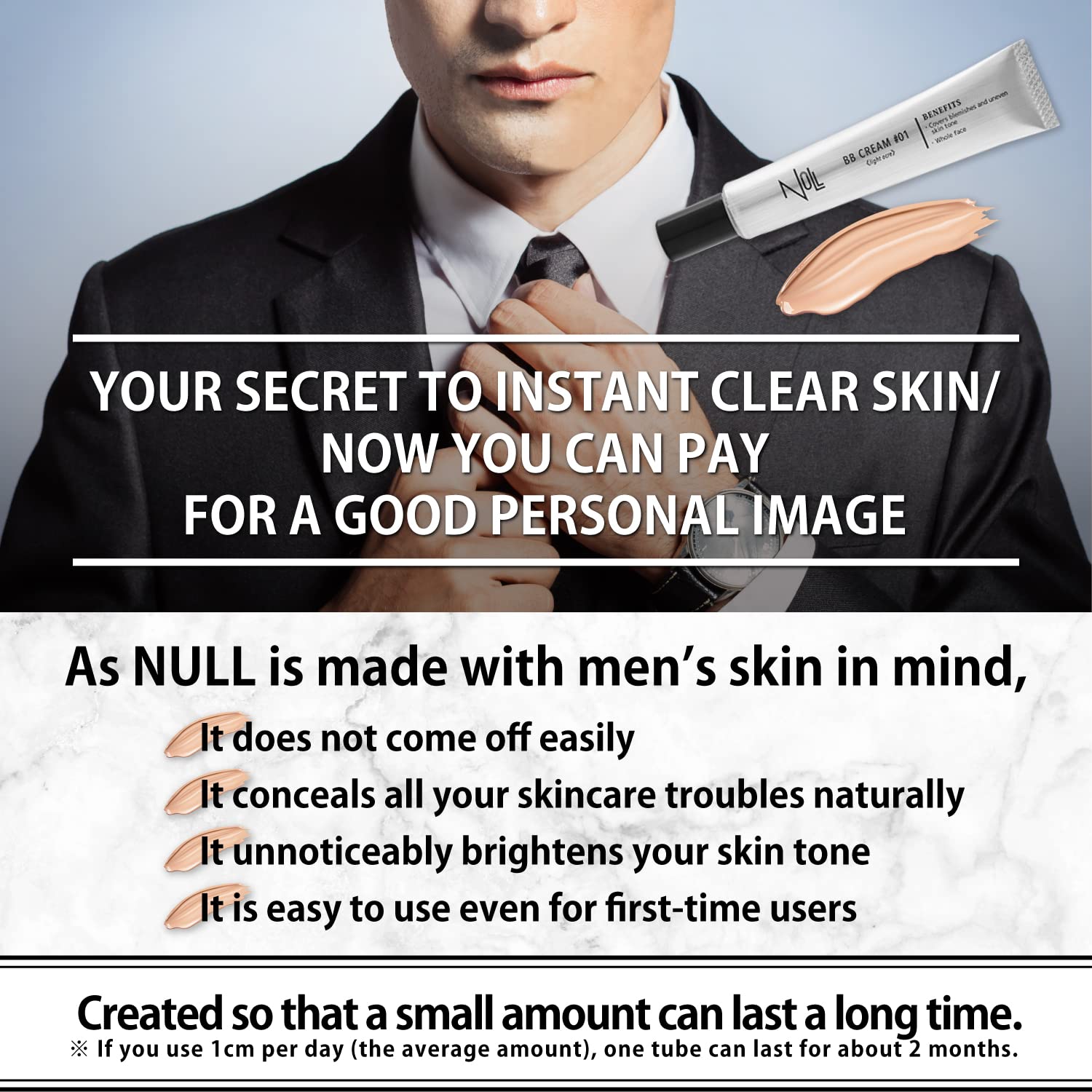 Never get caught! NULL BB Cream is developed from scratch to match the skin of men.