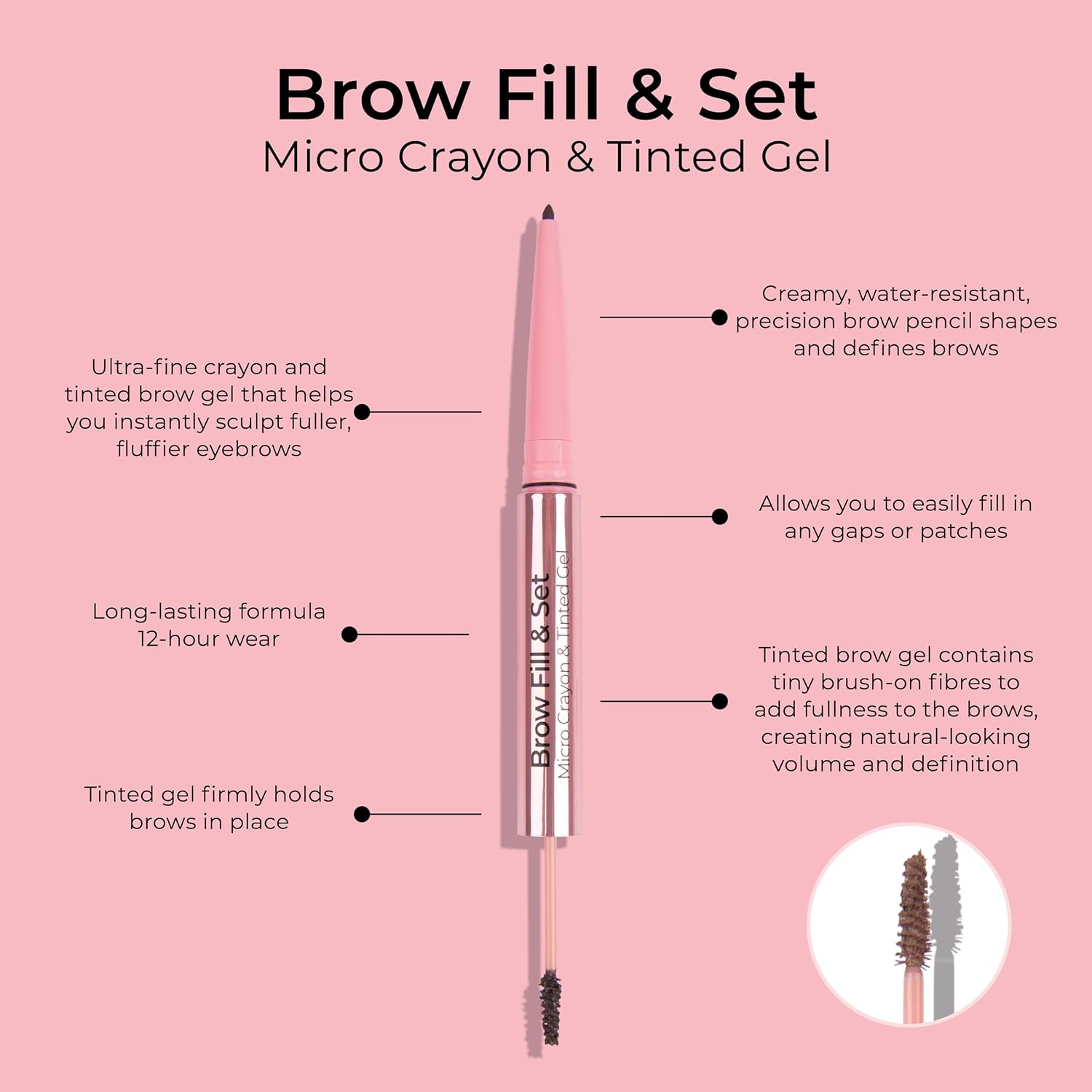 2-IN-1 TOOL TO SHAPE, DEFINE AND TINT YOUR BROWS: Brow Fill & Set combines a precision brow pencil with a tinted eyebrow gel in a dual-ended format. The design allows layered application to outline, fill, and adjust color, while remaining compact for easy storage in your makeup bag.