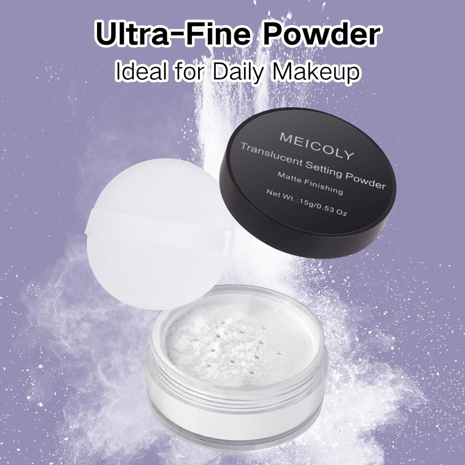 MEICOLY translucent setting powder features an ultra-fine texture that effortlessly blends into the skin, providing a smooth, flawless finish without clogging pores or feeling heavy,providing a natural and smooth finish,also great colorset powder for cream-based makeup.