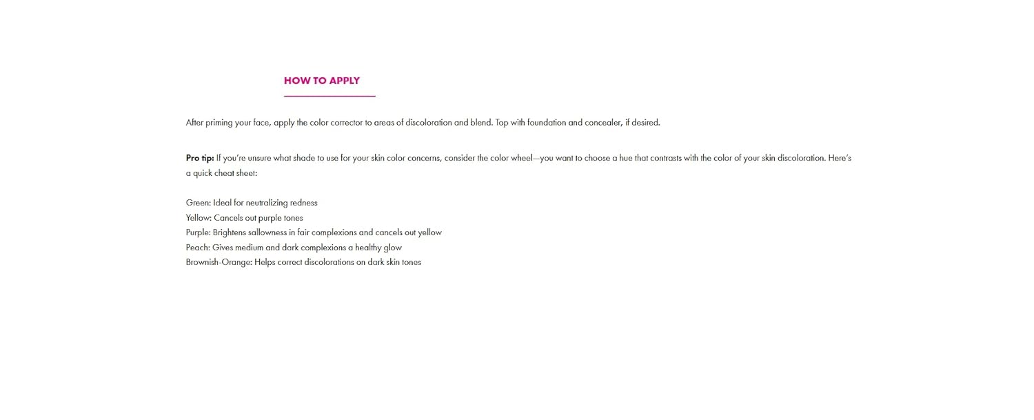 Correct and Conceal: Our palette helps conceal trouble spots and visibly correct discolorations; Light and medium camouflage imperfections, yellow and peach conceal dullness and dark circles, green covers redness, purple and pink brighten