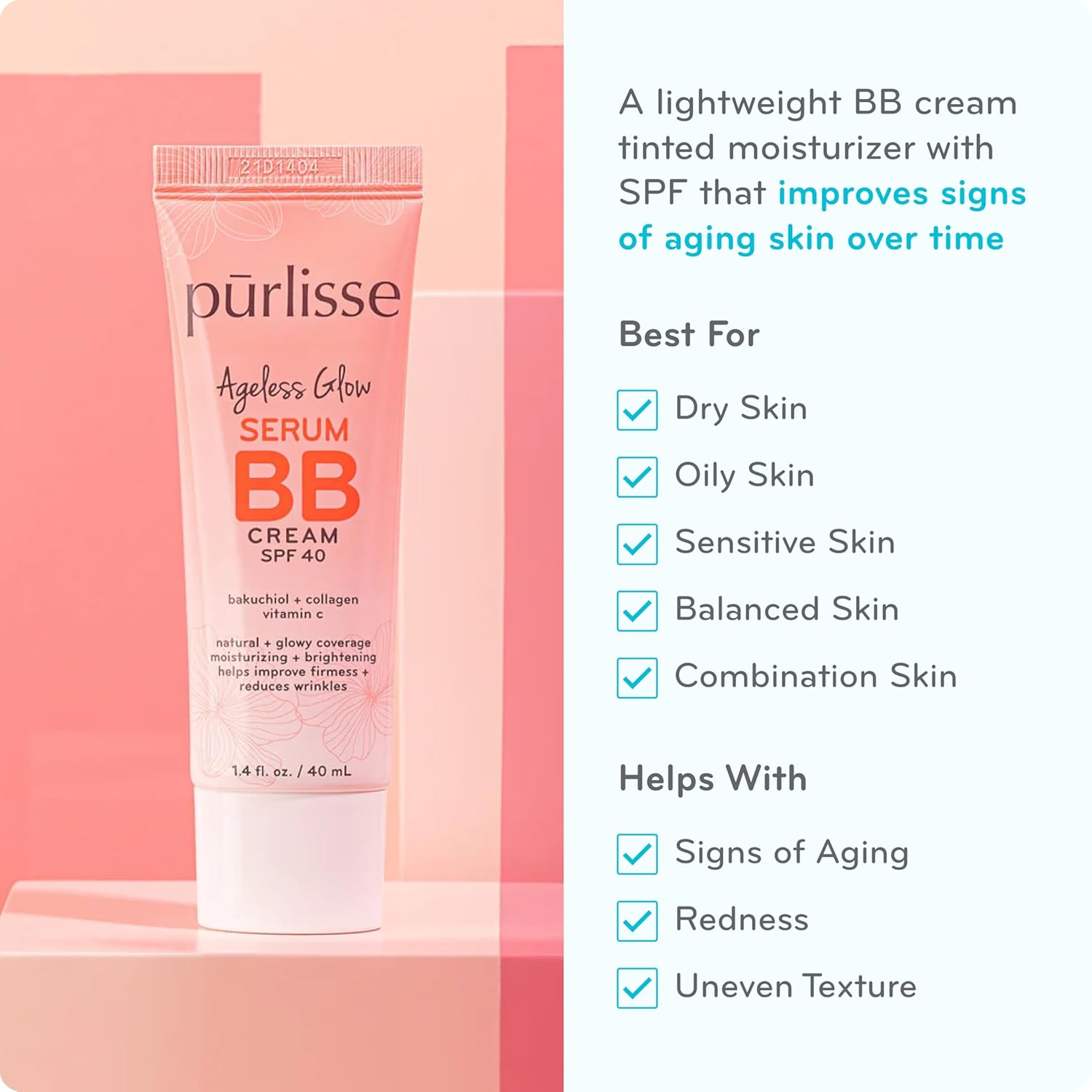 pūrlisse Ageless Glow Serum BB Cream SPF 40 – Glow BB Cream with SPF Enriched with Bakuchiol & Vitamin C to Help Improve Firmness & Reduce Wrinkles for Dewy Skin – Light Medium (1.4 oz)