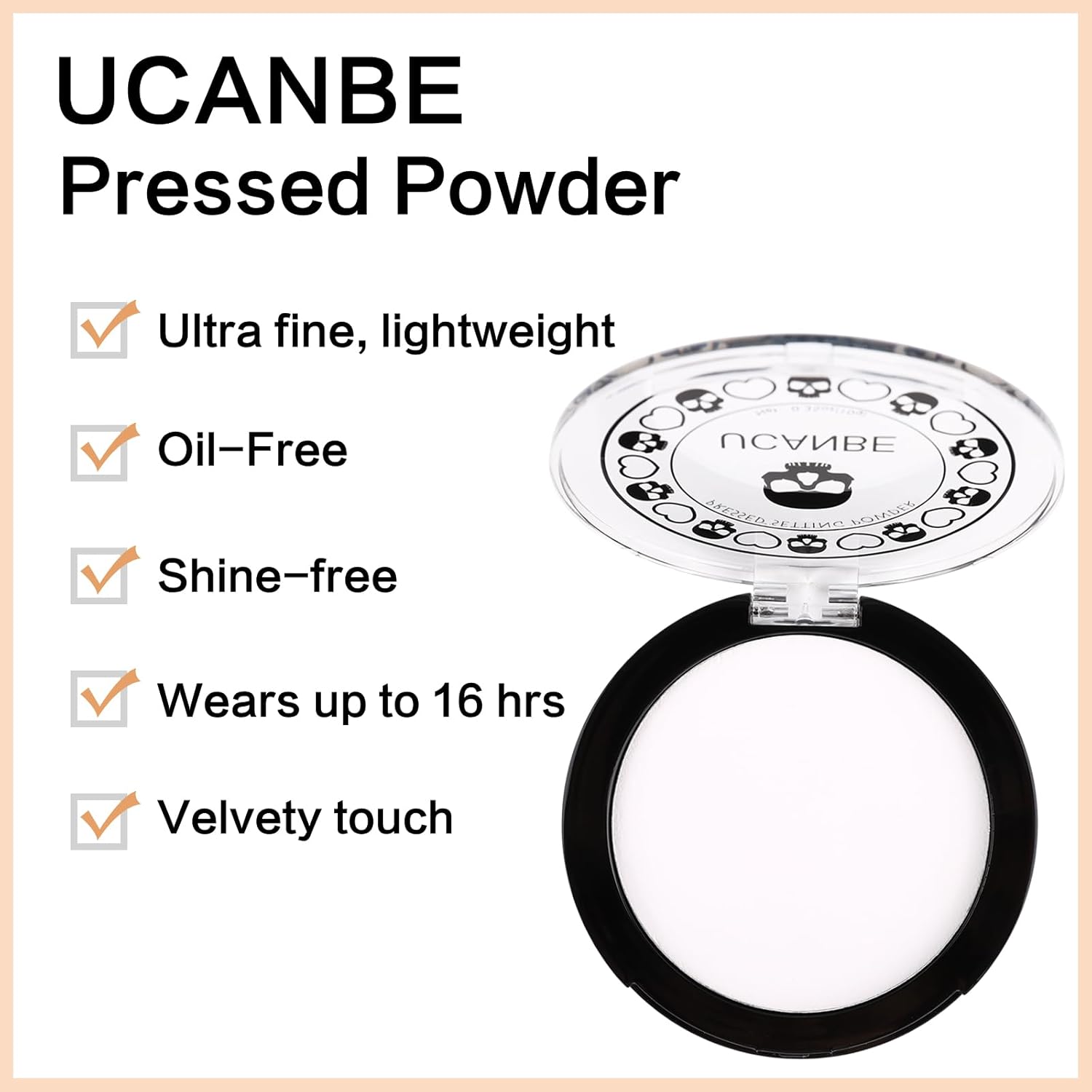 – UCANBE White Pressed Face Makeup Powder has a soft superfine texture that spreads evenly onto the skin, leaving a velvety smooth finish that perfectly secures your natural makeup look to last all day long. Vegan & Cruelty Free.